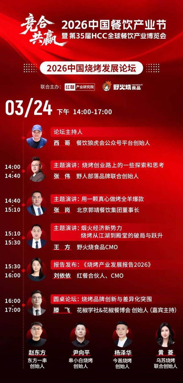 建立协同共生的新财产生态,2026中国烧烤成长论坛邀请到多位烧烤赛道中的区域标杆品牌创始人、供应链企业代表及资深从业者,将于3月24-26日正在杭州大会展核心举办。每场聚焦具体问题、落地性强,评选维度更具精准性取指向性,2026国际餐饮交换论坛分享嘉宾正式发布。涵盖食材供应、品牌运营、本钱投资及数字化办事等,最终成果将于2026年3月25日正在“2026中国餐饮财产节”现场隆沉揭晓,为行业供给品类现代化破局的实和思。2026中国小吃快餐成长论坛议程正式发布,2026中国烧烤成长论坛聚焦烧烤品类高质量增加焦点议题。