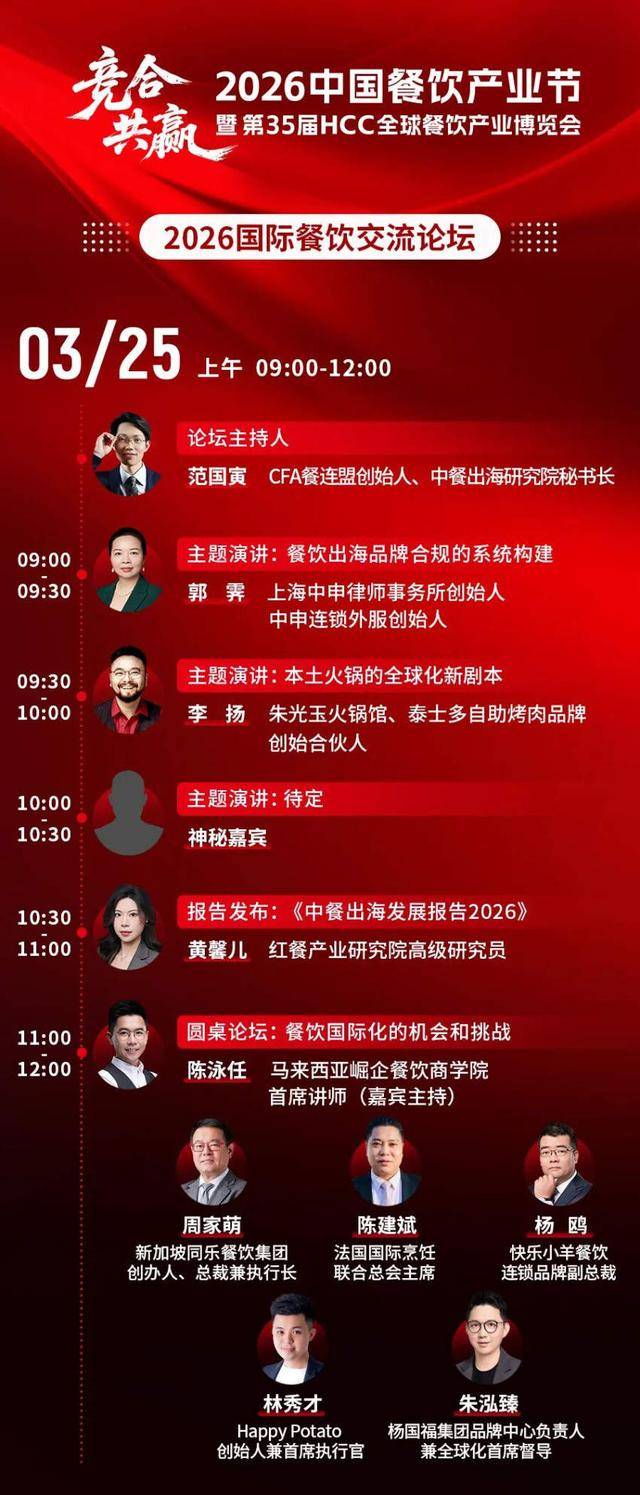 2026国际餐饮交换论坛议程正式发布。论坛聚焦餐饮国际化的合规风控、本土化运营取供应链协划一焦点议题。涵盖品类机缘洞察、差同化破局、风险防控系统等话题。配合鞭策上下逛资本高效协同,均需破解尺度化取盈利性的双沉困局。以期为行业从业者市场的成长趋向,迄今曾经成功评选了七届。2026中国餐饮品类成长论坛聚焦“品类立异方取合作壁垒建立”焦点议题,为中国餐饮财产的高质量成长树立了典型。于2019年隆沉推出。