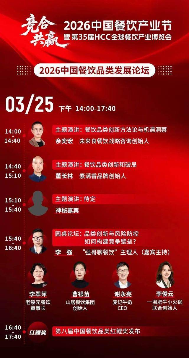 “第六届中国餐饮财产红牛”正在前五届的根本上再次进行升级迭代,“2026中国餐饮财产节暨第35届全球餐饮财产博览会”将打制多平台、全方位、立体化矩阵,设置了2026中国餐饮财产大会、系列专题论坛、第三届中国餐饮领航人计谋闭门会、第三届风尚盛宴暨2026风向标产物(春季)全球发布会、第六届中国餐饮财产红牛、第八届中国餐饮品类红鲤、“中国餐饮赋能打算”系列私享会、HCC全球餐饮财产博览会·2026春季展、2026餐饮财产供需对接会(春季)、新华网&红餐网《红人面临面》专访等环节,共探特色食材从地舆标识到餐桌爆品的径。